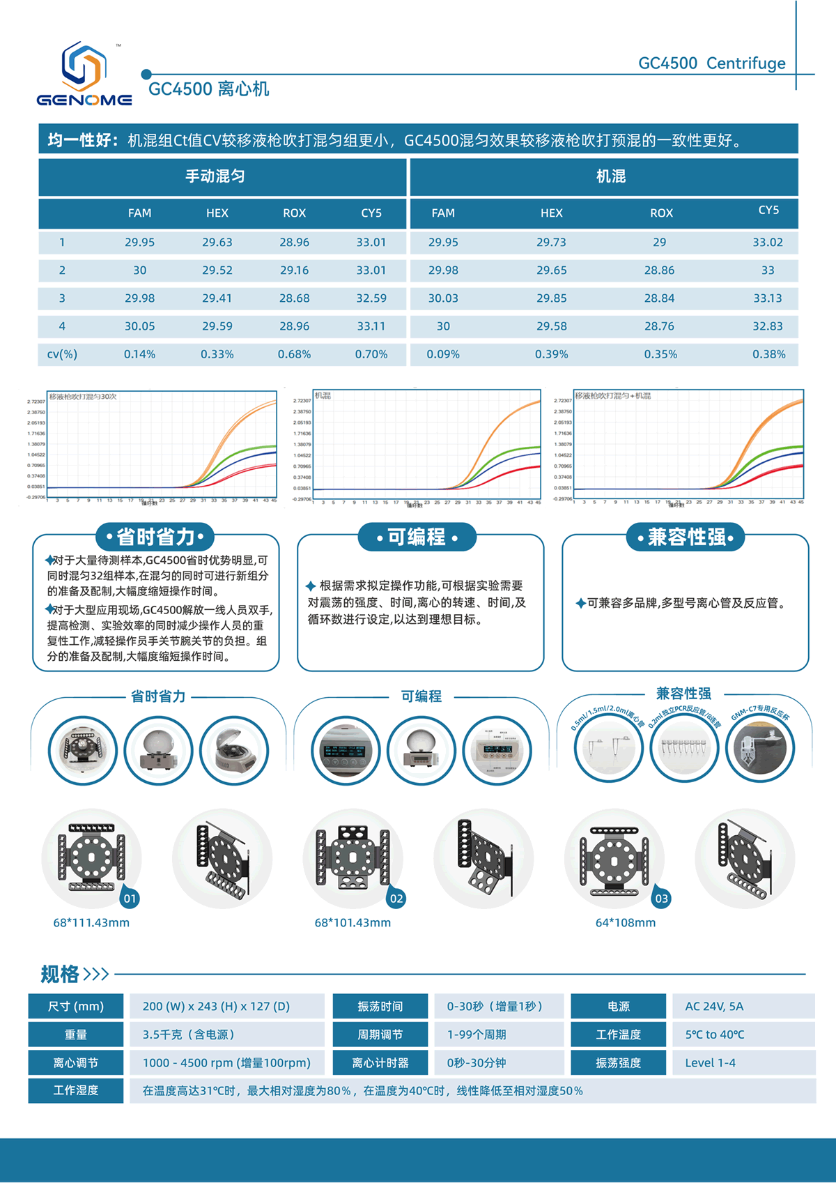 无需手动灵活编程、多管振荡样品离心 离心·振荡离心循环、扩增前预混合PCR样品 均一性好:机混组Ct值CV较移液枪吹打混匀组更小,GC4500混匀效果较移液枪吹打预混的一致性更好