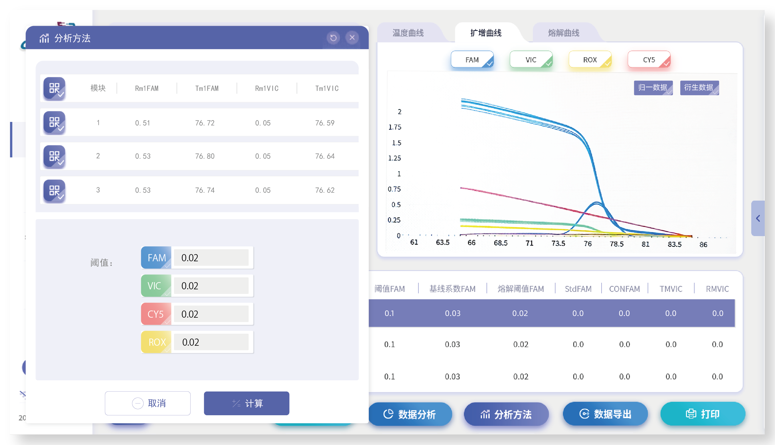 · 数据分析算法:实时荧光曲线拟合、Ct值计算、多靶标自动判读、异常值识别与质控分析;